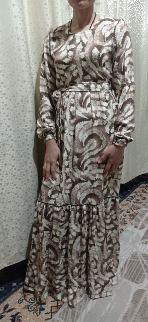 Kahverengi ve gri tie-dye desenli, uzun kollu ve yüksek yakalı bol kesim uzun elbise. Belde bağlama detayı ve drapeli tasarımı ile bohem tarzına uygun. ozel dikimdir hic giyilmedi
