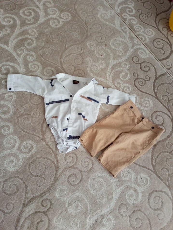 Pamuklu uzun kollu, yaka detaylı üst ve bej şorttan oluşan bohem tarzda bebek erkek takımı. Rahat ve şık bir kombin sunar.