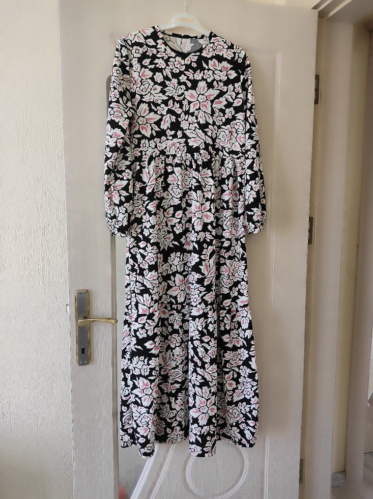 Uzun kollu, yüksek yakalı, bol kesim ve drapeli bu elbise koyu renkli çiçek deseni ve pembe detaylar taşır.