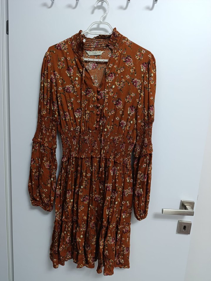 Kahverengi uzun kollu elbise, V yakalı ve düğmeli önüyle bol kesimdir. Çiçek desenli, yumuşak sentetik kumaştan günlük kullanım için uygundur.