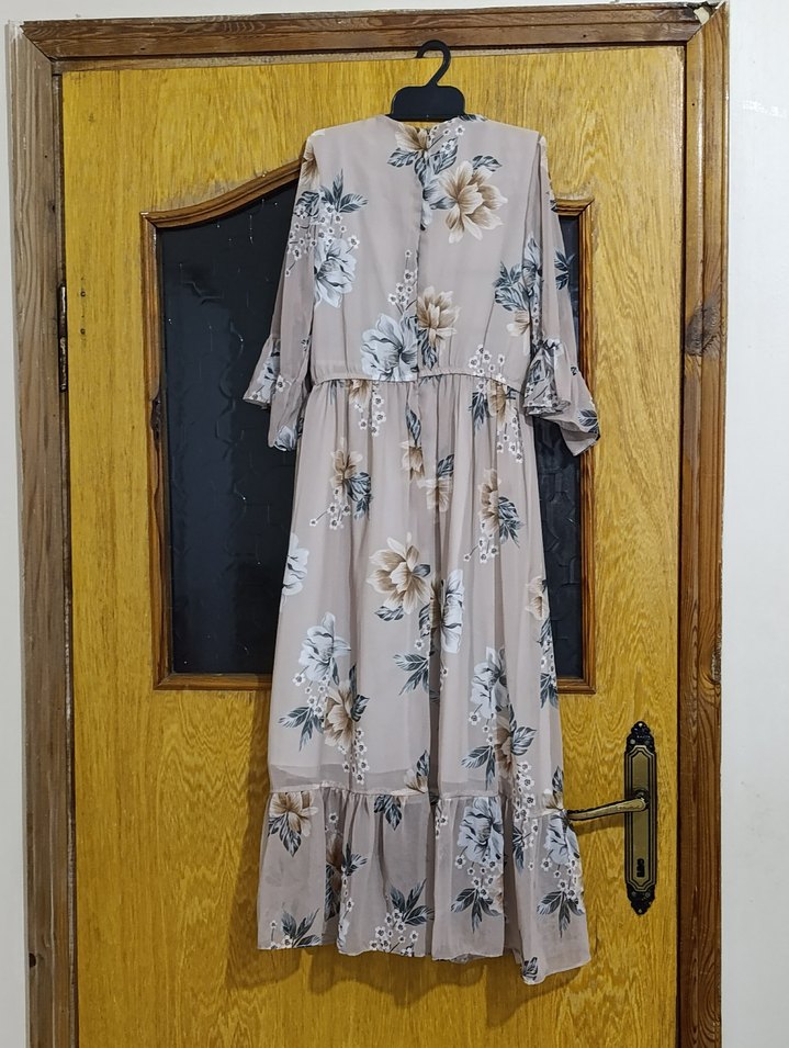 Uzun kollu, bol kesim bu elbise yüksek yakalı ve volanlı etek ucu detayına sahiptir. Gri ve bej çiçek desenlidir, yumuşak sentetik kumaştandır.