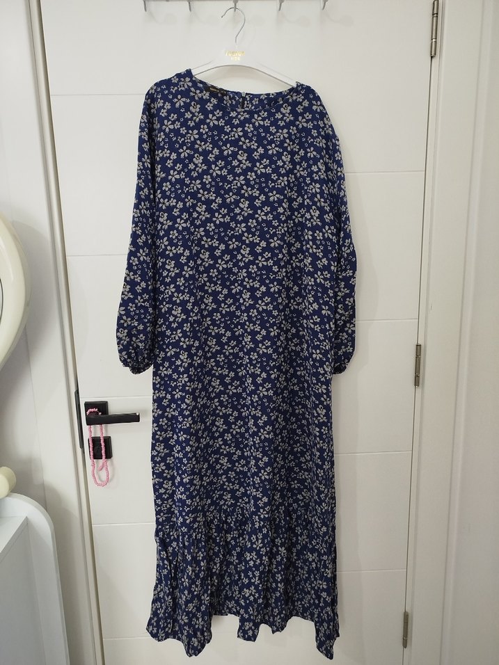 Mavi renkli, uzun kollu, salaş kesim bohem tarzda, yumuşak sentetik kumaştan yapılmış, yuvarlak yakalı ve fırfır detaylı uzun elbise.