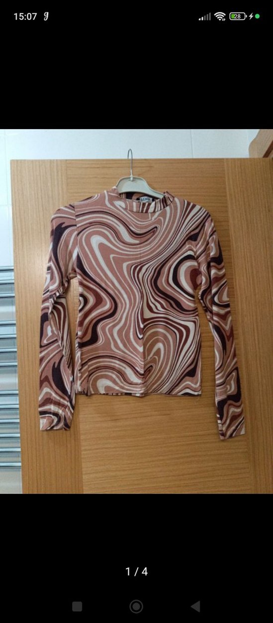 Uzun kollu, bohem tarzda, kahverengi tie-dye desenli, boğazlı ve pile detaylı, midi uzunlukta dar kesim bluz.