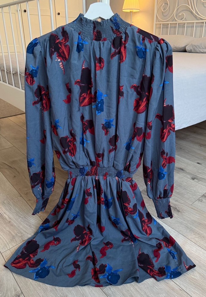 Yumuşak sentetik kumaştan, yüksek yakalı ve uzun kollu, bol kesim uzun elbise. batik deseni ve bohem tarzıyla romantik buluşmalar için uygun.