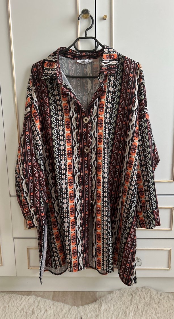 Bohem desenli, uzun kollu, bol kesim kadın gömleği. V yaka ve düğmeli, koyu çok renkli tekstil kumaştan yapılmıştır.