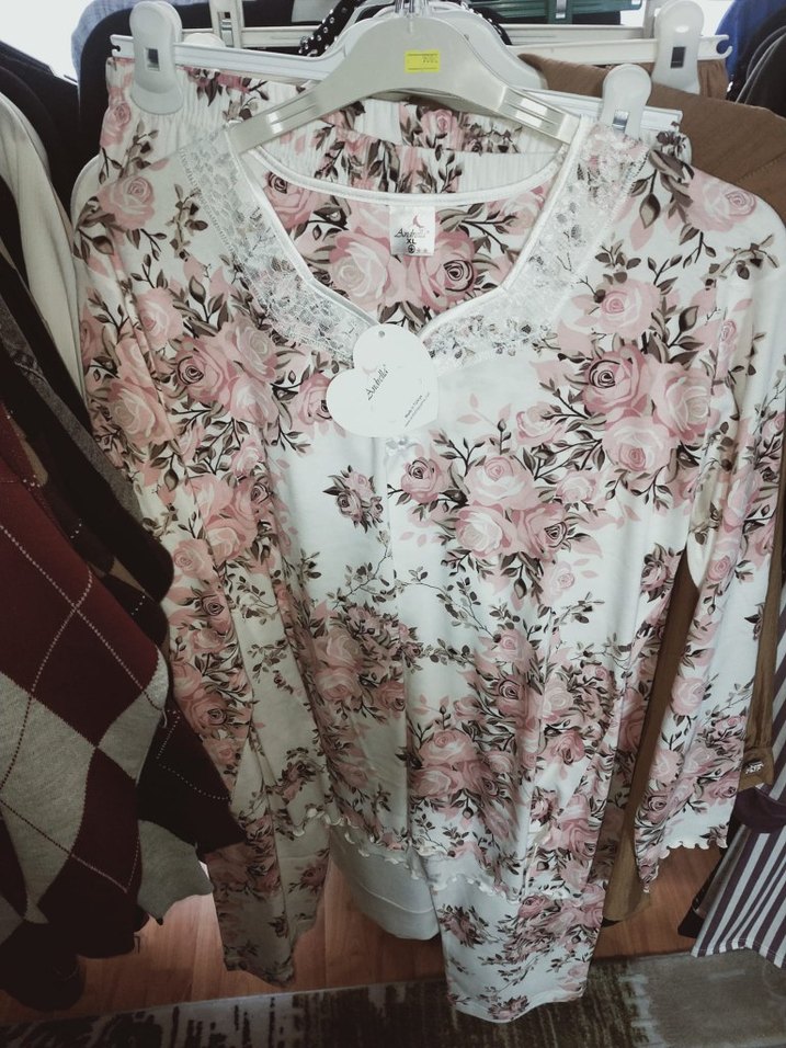 Beyaz zemin üzerinde pastel tonlarda çiçek desenli, uzun kollu, bol kesim kadın pijaması. Bohem tarzda ve rahat bir kumaşa sahip.