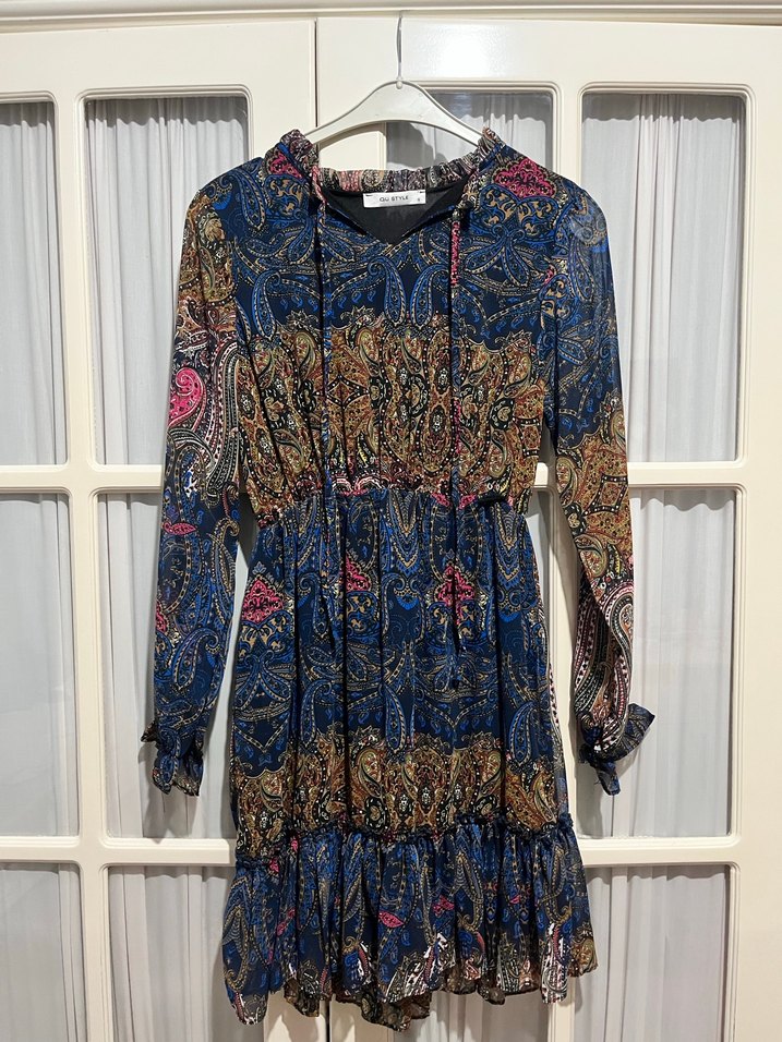 Uzun kollu, bol kesim ve yüksek yakalı mini elbise. Karanlık tonlarda çok renkli batik desen ve volan detaylarına sahiptir.