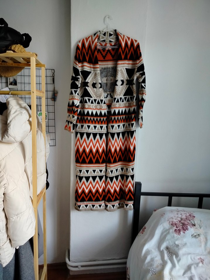 Uzun, bol kesim, örgü yapılı kalın hırka koyu renkli çok desenlidir ve V yakaya sahiptir. Bohem tarzını yansıtarak günlük kullanıma uygundur.