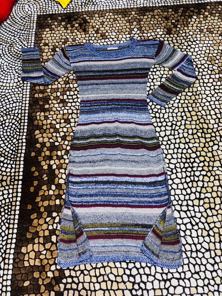 Uzun kollu, bohem tarzda, ince ve desenli triko elbise. Çok renkli çizgili deseni ve vücuda oturan kesimi ile günlük kullanıma uygundur.