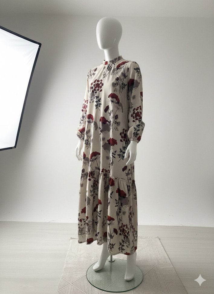 Yüksek yakalı, uzun kollu, bol kesim bu uzun elbise yumuşak sentetik kumaştan yapılmıştır. Gri ve beyaz çiçek desenli, bohem tarzı için uygun drapeli tasarıma sahiptir.