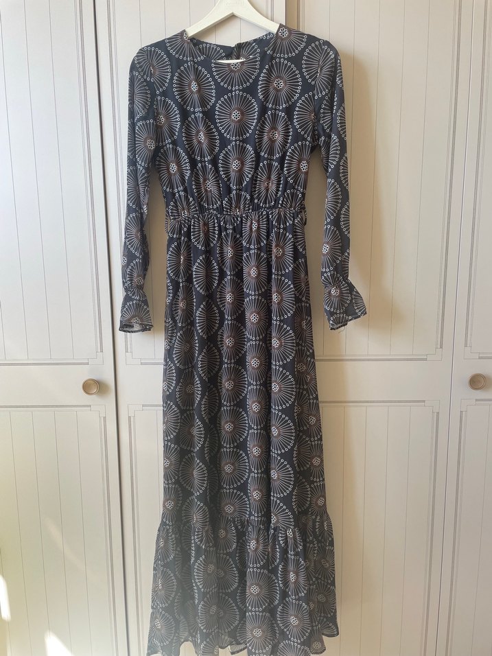 Uzun kollu, bol kesim elbise, yuvarlak yaka ve yumuşak sentetik kumaştan yapılmıştır. Koyu kahverengi batik desenli ve fırfır detaylıdır.