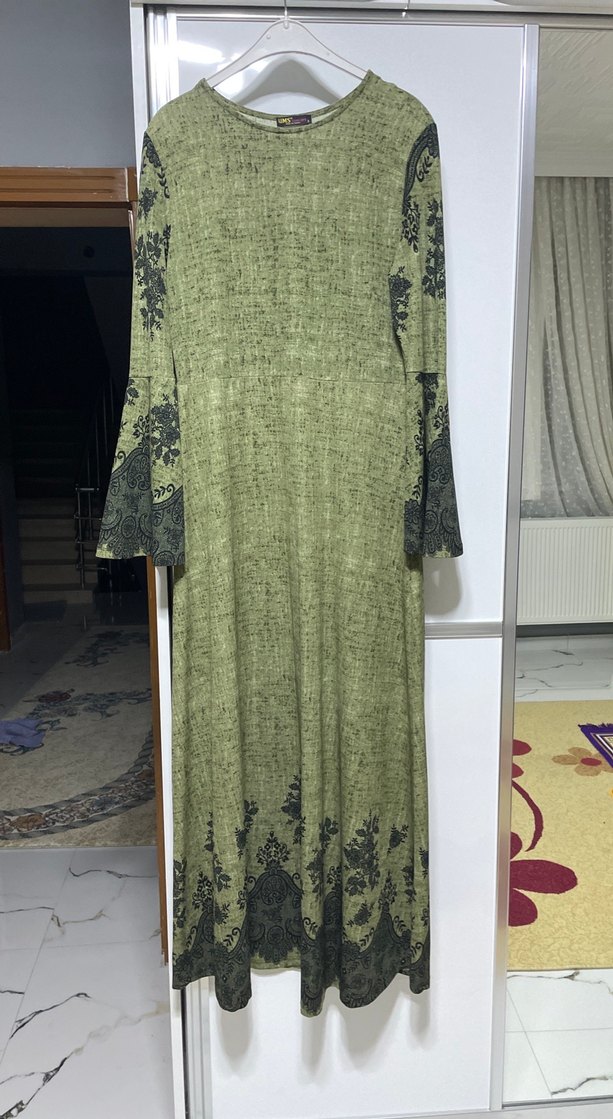 Bu uzun ve bol kesim elbise, drapeli tarzda, yuvarlak yakalı ve uzun kolludur. Yeşil ve gri desenli bohem tarzı için uygundur.
