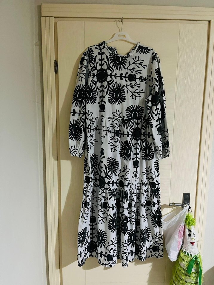 Geniş kesim, uzun kollu, tekne yaka ve fırfır detaylı, gri-beyaz tie-dye desenli bohem tarz uzun elbise. Günlük kullanıma uygundur.