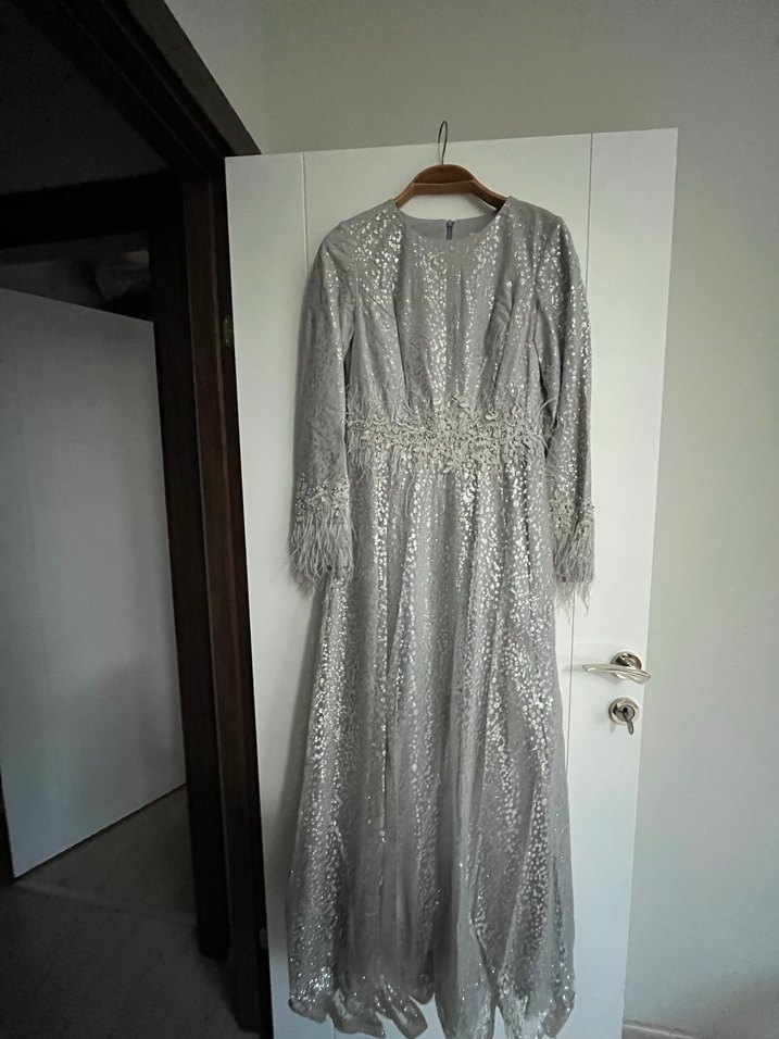 Nakışlı desenler ve uzun kollu, drapeli bu uzun gri elbise, tekne yaka ve bol kesimlidir. Klasik bohem tarzda düğünler için uygundur.