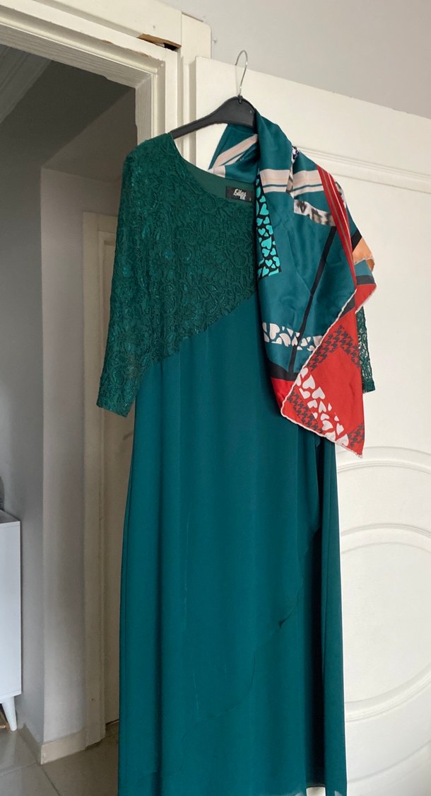 Uzun kollu, straplez detaylı, bol kesim hamile abiye elbise. Tekstilden yapılmış, koyu turkuaz renkli, desenli bohem tarzında, düğünler için uygundur. Eşarbı hediyedir anne elbisesidir