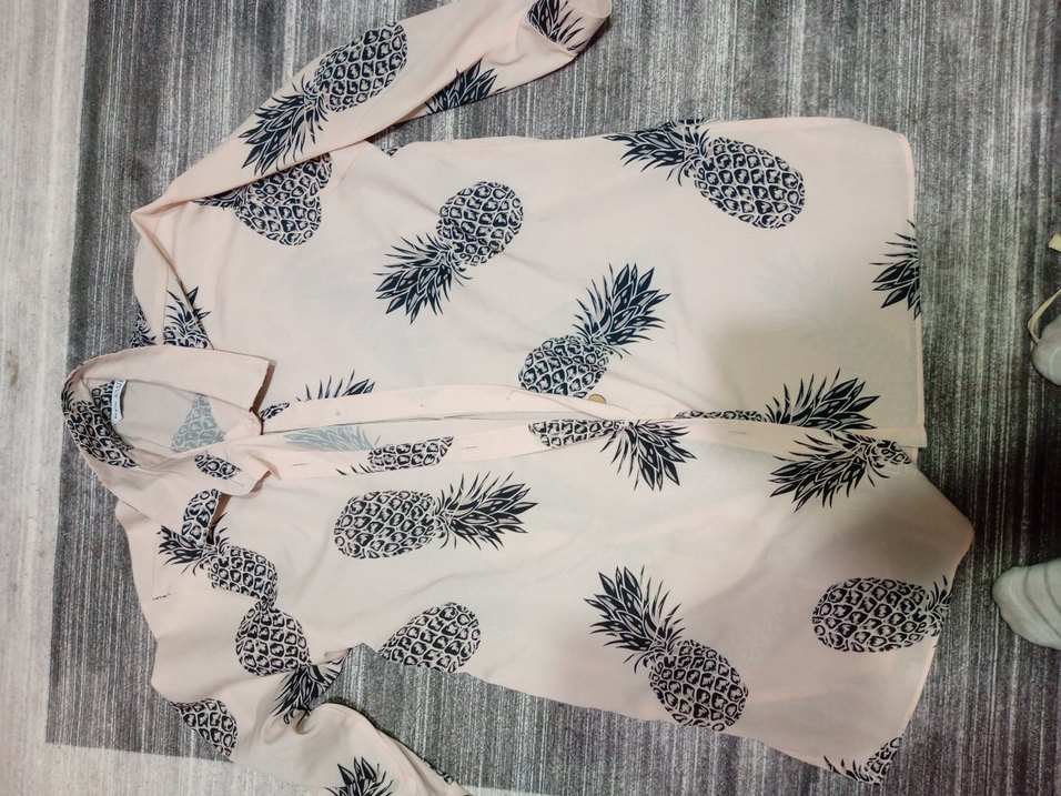 Bol kesim, uzun kollu bohem tarzırı vardır. Hafif sentetik kumaştan, ananas desenlidir, günlük kullanıma uygundur.
