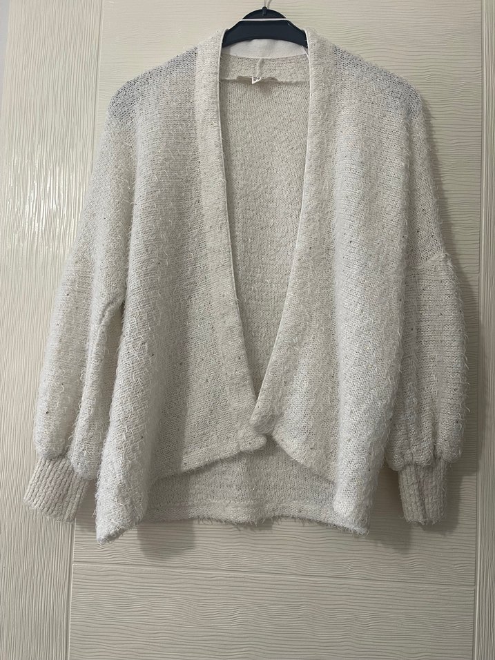 Yumuşak beyaz ,pullu örgüden, uzun kollu, salaş kesim bohem tarzda, günlük kullanıma uygun rahat kadın hırkası. Kol detaylarına dikkat edelim