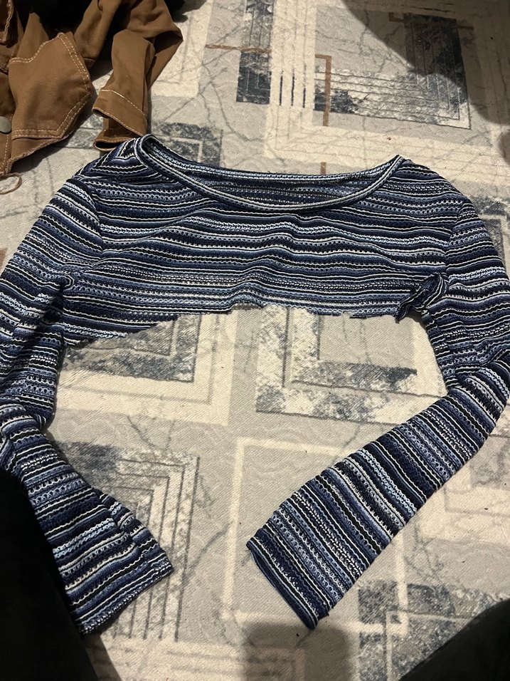 Uzun kollu, kayık yaka ve triko kumaştan yapılmış, bohem tarzda, mavi-gri tie-dye desenli kadın kazak. Rahat kullanım için uygun. temudan almıştım kestim yarıdan