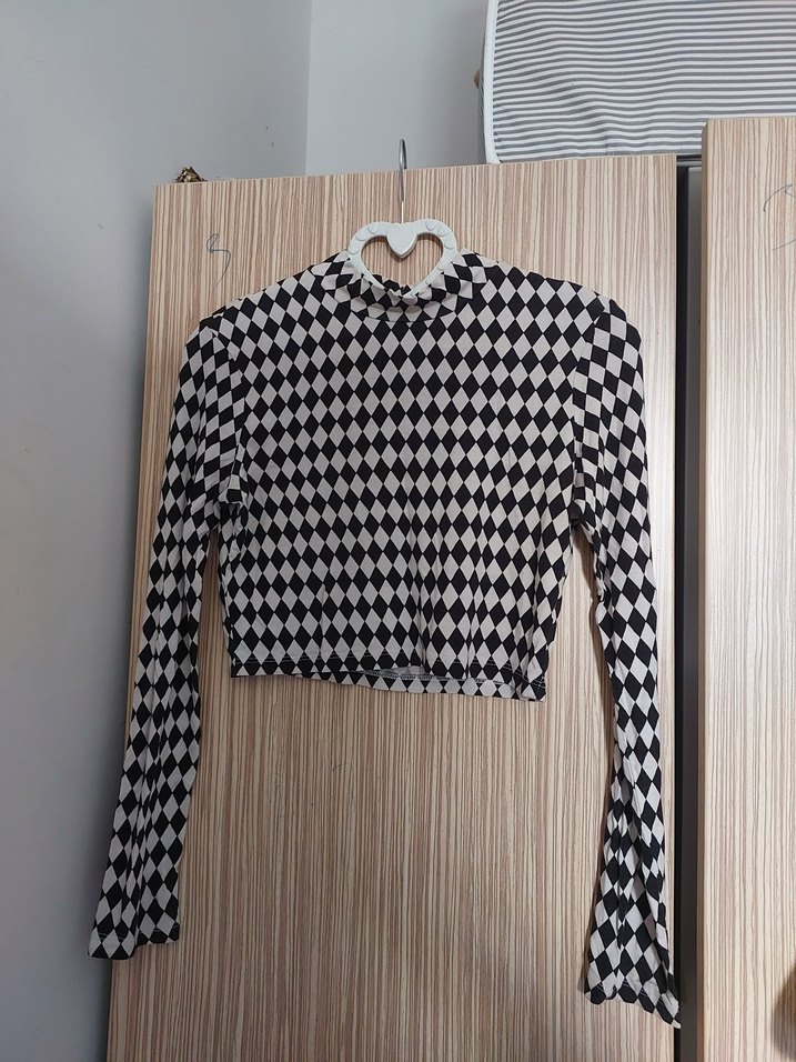 Uzun kollu, boğazlı ve kareli desene sahip bu kadın bluzu, yumuşak örme kumaştan olup bohem tarzı ve midi boyuyla günlük kullanıma uygundur.