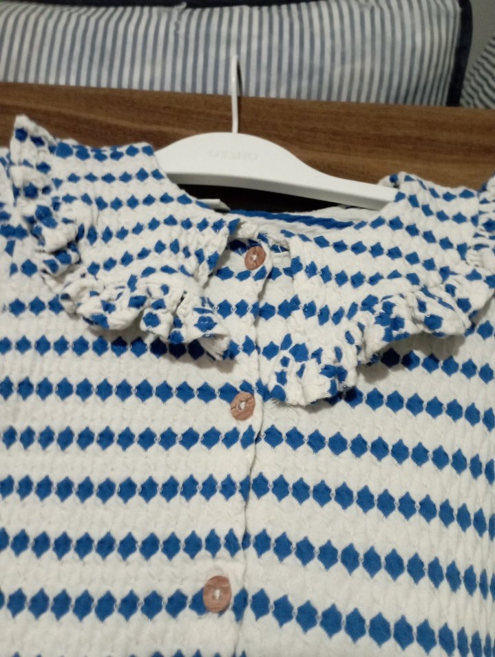 Uzun kollu, tekne yaka, pileli tasarımlı bol kesim kız çocuk elbisesi. Beyaz ve mavii tonlarda batik desenlidir, bohem tarzını yansıtır. 4-5 yaş bir kaç kere giyinildi