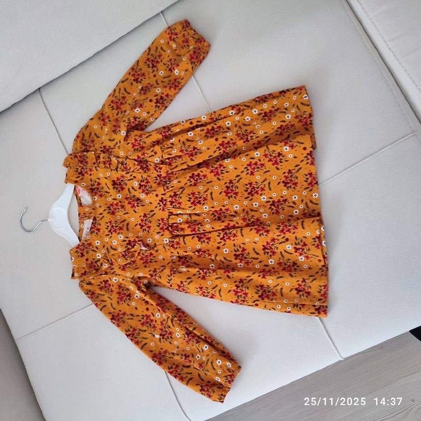 Uzun kollu, V yaka ve renkli baskılı fırfırlı bol kesim bohem kız elbisesi, yumuşak sentetik kumaştan yapılmıştır.