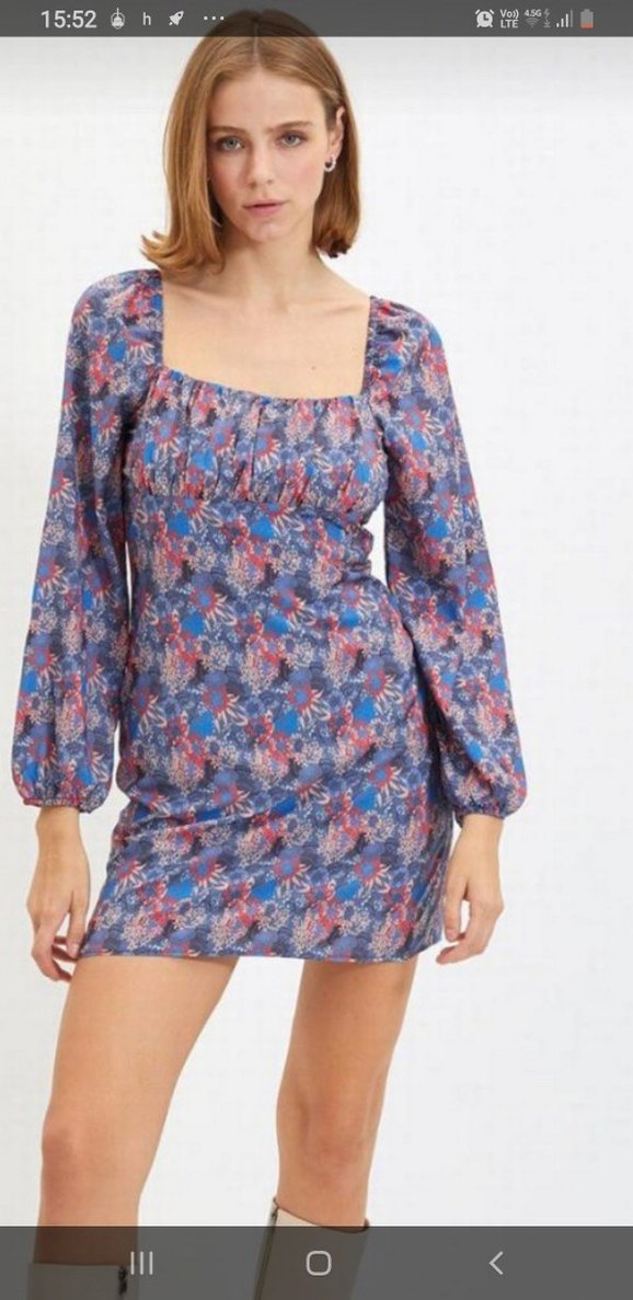 Uzun kollu, tek vücut kesimli bu bohem elbise, tekne yaka ve lacivert-gri batik desenlidir. Drapeli detaylarıyla romantik akşamlar için uygun.