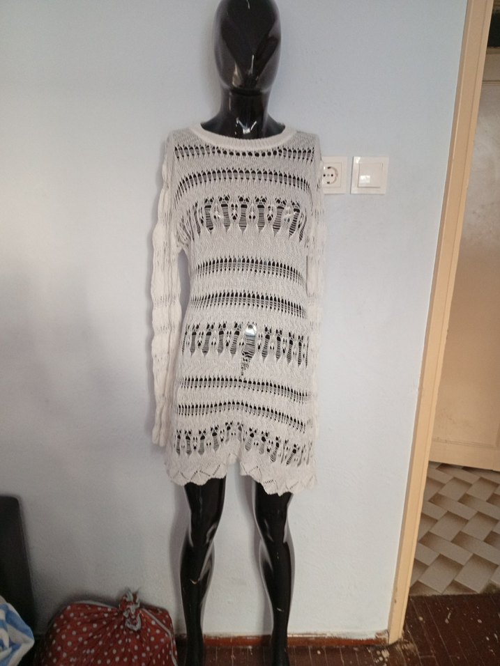 Uzun boy, bol kesim ve yuvarlak yakalı kadın kazak. Bohem tarzda nakışlı örgü, beyaz ve gri tonlarda, günlük kullanıma uygun.
