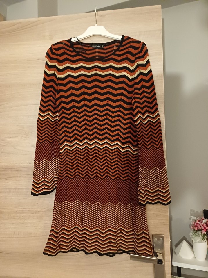 Uzun kollu, bol kesim ve tekne yaka örgü elbise. Koyu kahverengi çizgili deseniyle rahat ve bohem tarzda, günlük kullanıma uygun.