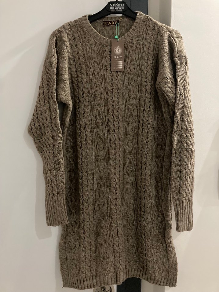 Bu kahverengi örgü kadın tunik kazak, uzun kollu ve yuvarlak yakalıdır, bol kesimiyle rahat ve bohem bir tarz sunar.