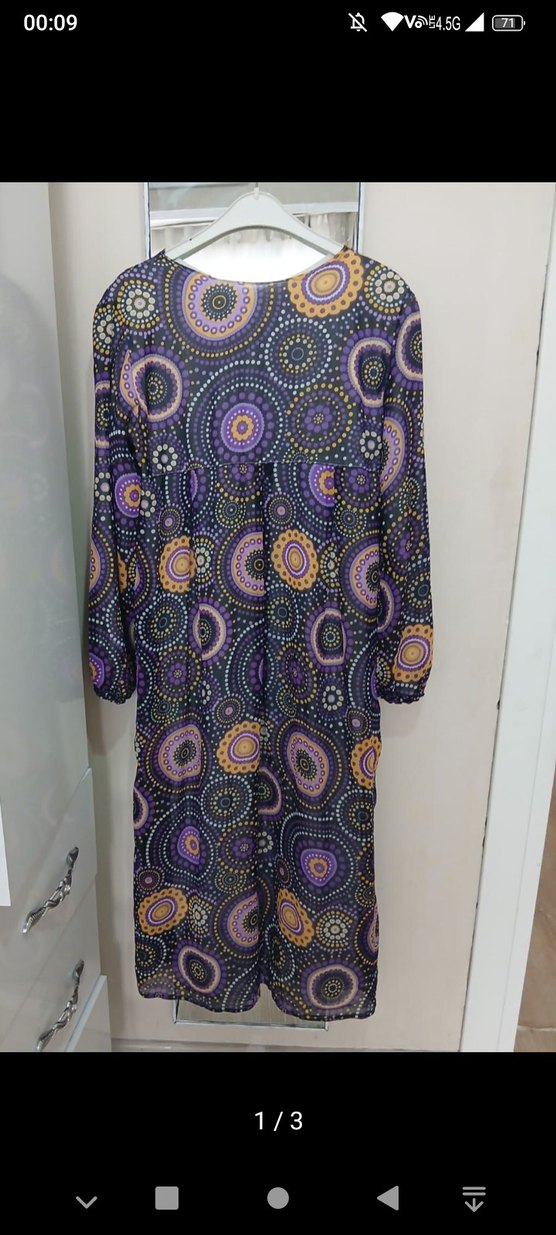 Uzun kollu, bol kesim elbise, sentetik kumaştan, koyu renkli çok renkli bohem tie-dye desenli. Pliseli detaylara sahip, günlük kullanım için uygundur.