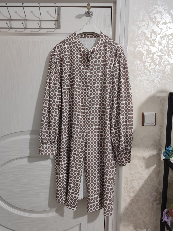 Uzun kollu, bol kesim kadın elbisesi, bej ve gri puantiyeli desene sahip, bohem Paris tarzını yansıtıyor.