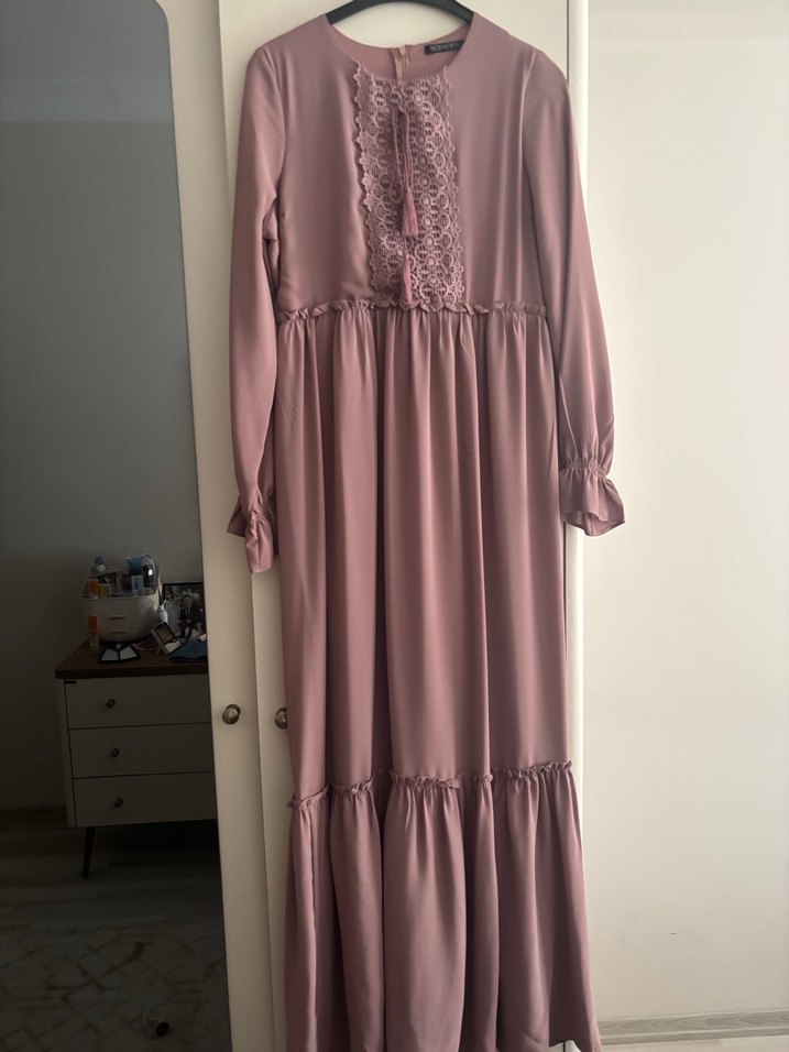 Pastel bej renkli, uzun kollu, bol kesim bohem elbise. Nakış detayları ve fırfır süslemeleri vardır, günlük kullanıma uygundur.