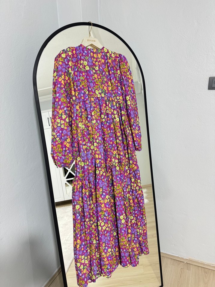 Renkli batik desenli, pilili detaylı uzun kollu, bol kesim bohem elbise. Yuvarlak yakalı ve yumuşak sentetik kumaştan üretilmiştir.
