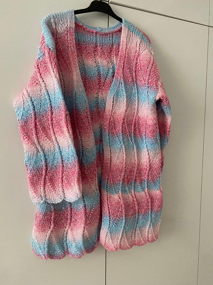 Uzun kollu, bol kesim, pastel tie-dye desenli triko hırka. Yumuşak örgü kumaştan, rahat ve bohem tarzda, günlük kullanıma uygun.