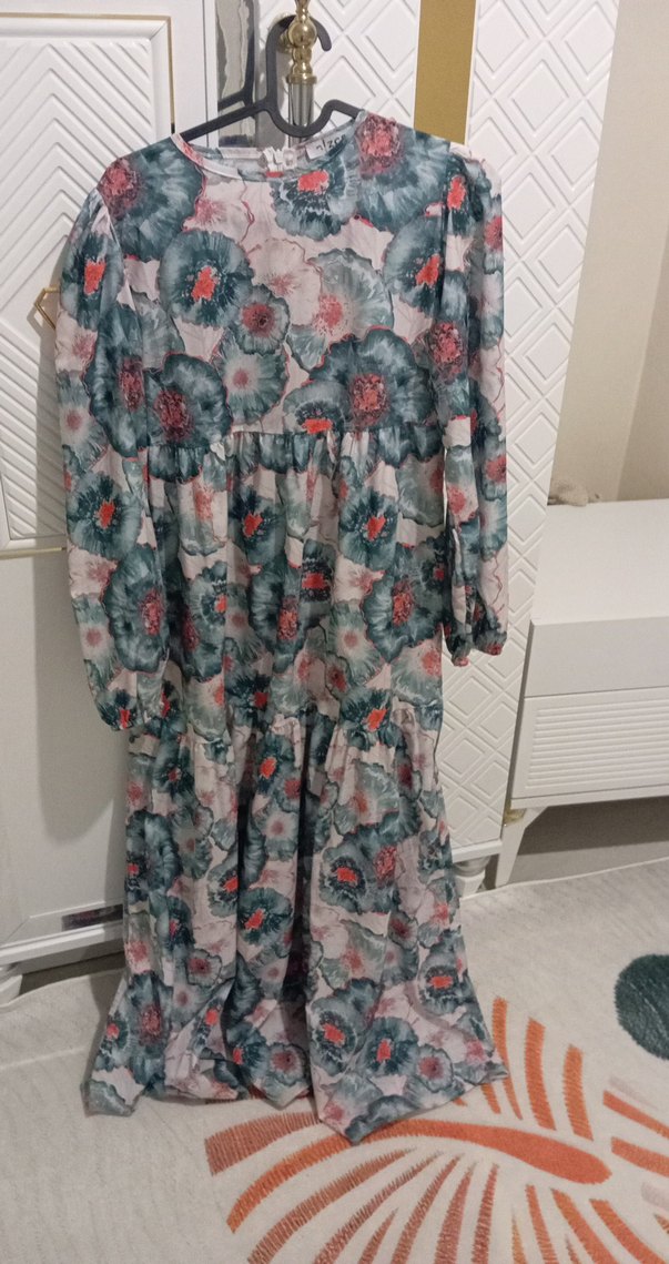 Yüksek yakalı, uzun kollu, bol kesim, sentetik kumaştan yapılmış, tie-dye desenli ve fırfırlı bohem tarzda uzun elbise.