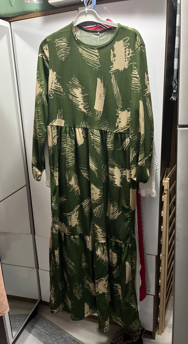 Uzun kollu ve yuvarlak yakalı, bol kesim ve pileli detaylara sahip uzun yeşil elbise. Sentetik kumaştan yapılmış, koyu tonlu batik desenlidir, bohem tarzını yansıtır.