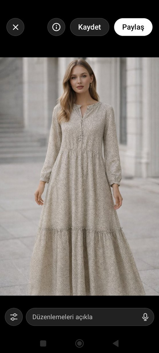 Uzun kollu, bej renkli yılan desenli bu elbise, bol kesim ve fırfır detaylara sahiptir. Yumuşak sentetik kumaştan yapılmıştır, minimal bohem tarz için uygundur.