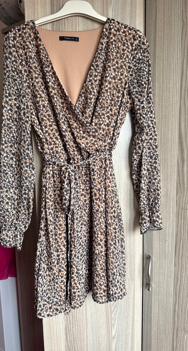 Uzun kollu, bol kesim kadın elbise, koyu kahverengi yılan desenli ve bohem tarzındadır. Bedeni 34 ama biraz salaş ,şifon elbise