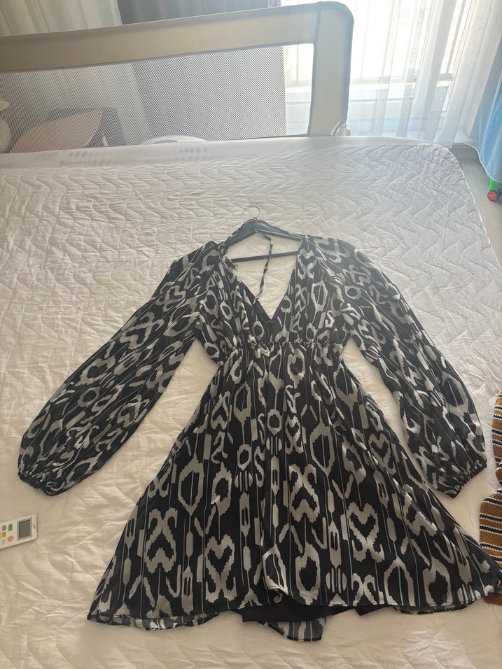Uzun kollu, bol kesim yılan desenli, kürk detaylı V yaka bohem tarzda tulum, gri ve siyah renklerde.