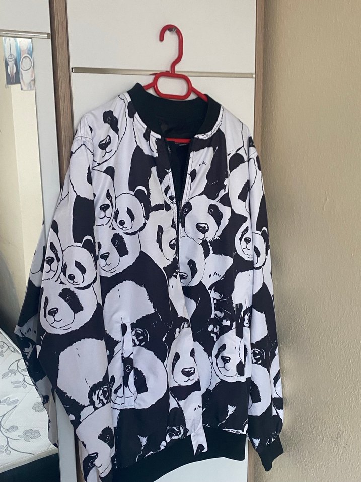 Gri renkli, bol kesim kadın ceketin üzerinde panda baskısı bulunur. Uzun kollu, düğmeli ve yuvarlak yaka detaylıdır. Midi boyda, sokak stiline uygun bir parça.