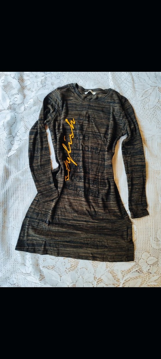 Uzun kollu, bol kesim kadın tunik, yuvarlak yaka ve örme, baskılı desene sahiptir. Kahverengi ve gri tonlarda, rahat sokak stiline uygundur.
