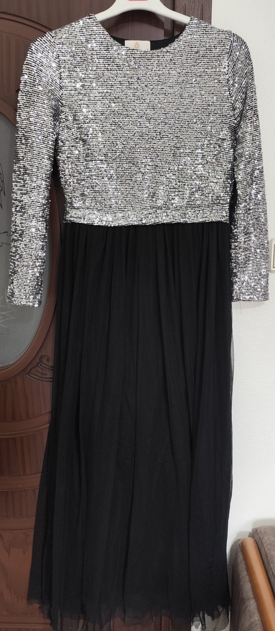 Uzun kollu, tek renk siyah etek ve gri dokulu üstten oluşan, bol kesim ve drapeli uzun elbise. Tekne yaka ve şık görünümüyle düğünler için uygun. ✨