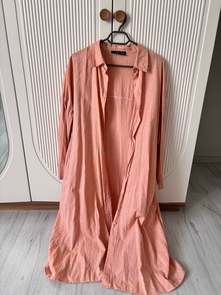 Ürünün herhangi bir sorunu yoktur düğme detaylıdır. 1.60 boyunda dizden bir karış aşağısına denk gelmekte.