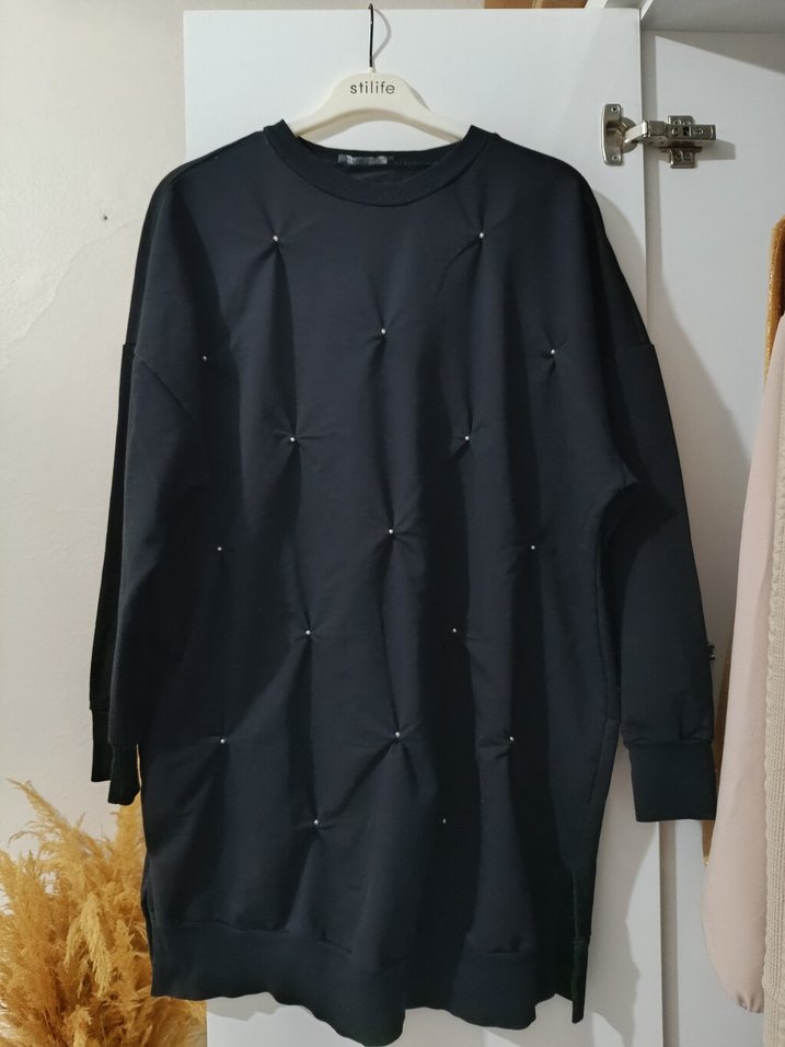 Uzun kollu, yuvarlak yaka ve bol kesim siyah tunik. Sentetik kumaştan, boncuk detaylı, günlük kullanıma uygun rahat bir sokak stili parçası.