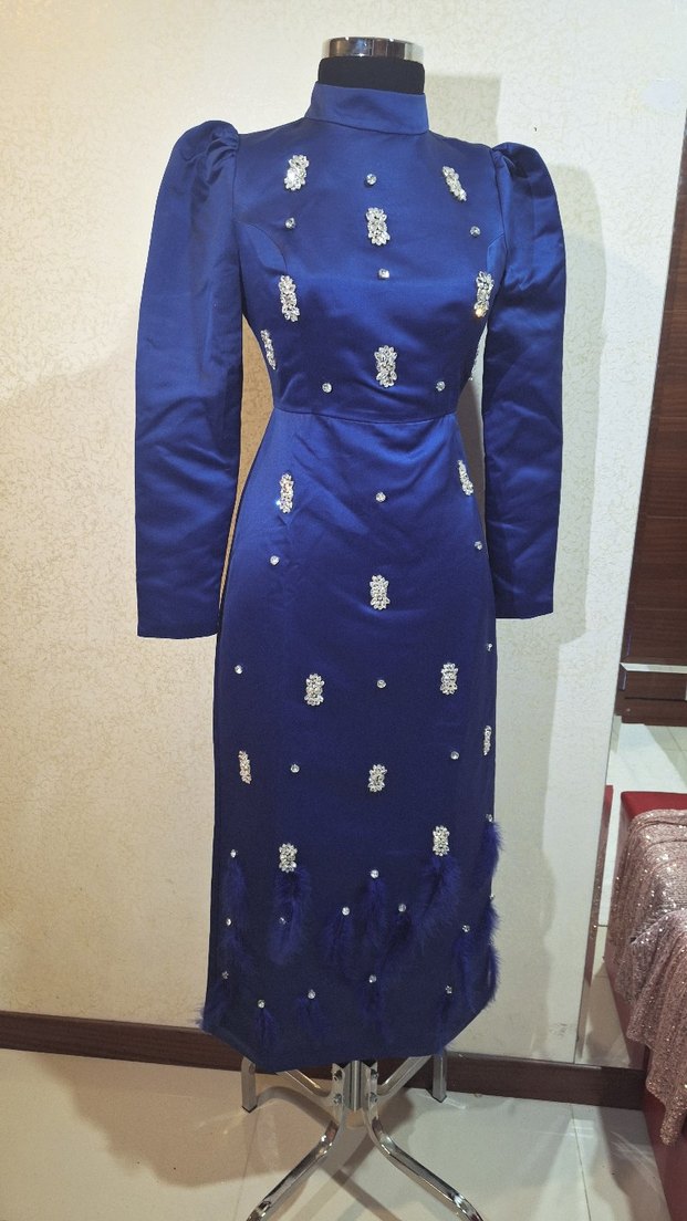 Parlak mavi kumaştan, boncuk işlemeli, uzun kollu ve yakasında kesik detay bulunan uzun abiye elbise. Düğünler için klasik ve vintage tarzda, rahat kesim.