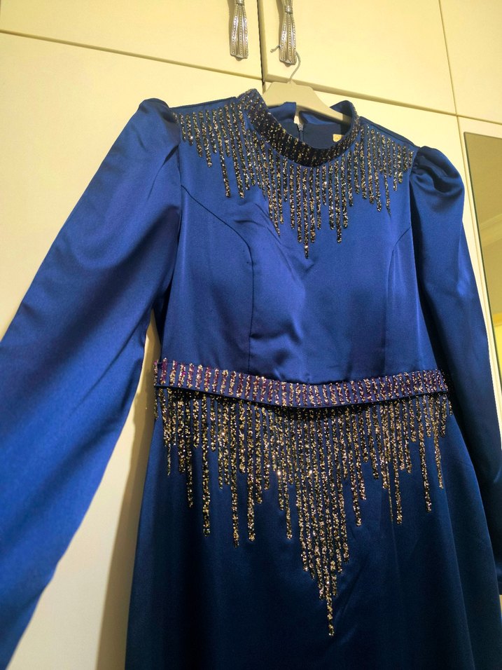 Uzun Kollu Boncuk İşlemeli Mavi Abiye Elbise