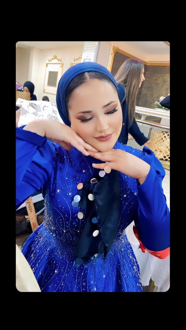 Boncuk işlemeli, uzun kollu, halter yaka, parlak mavi renkli, etnik desenli, dar kesim henna elbise, mütevazı düğünler için uygun.