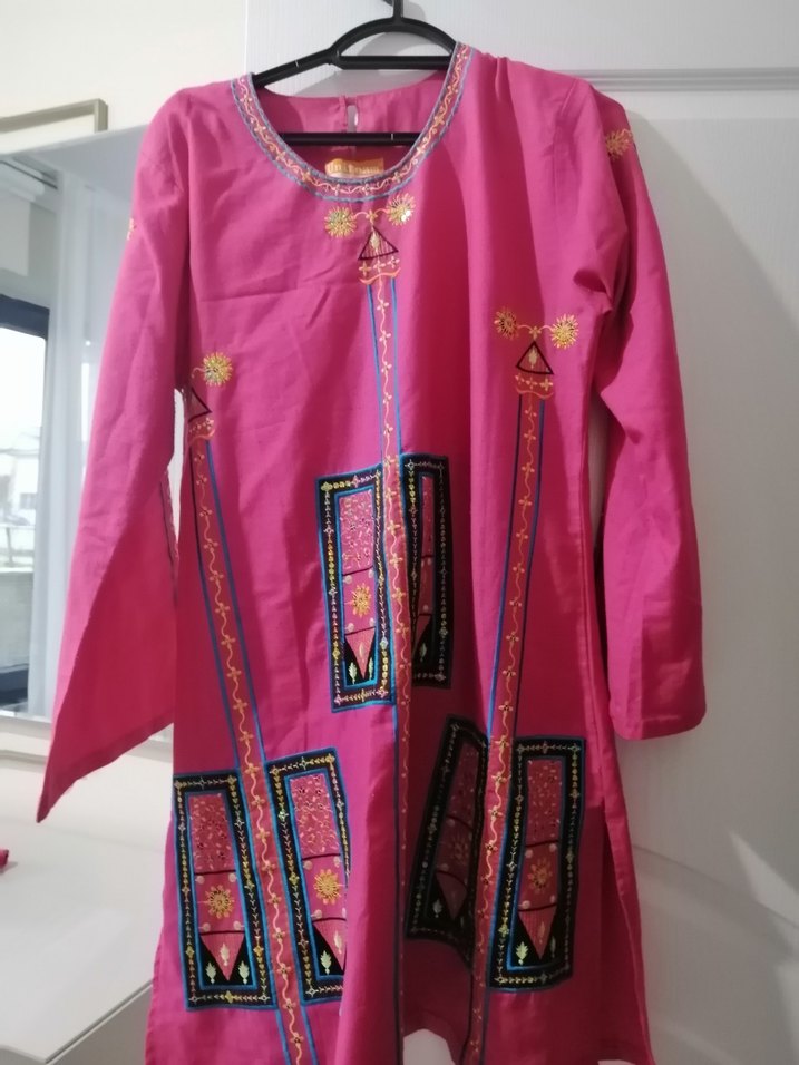 Uzun pembe tunik, renkli işlemeler ve boncuk detaylarıyla bohem tarzı yansıtıyor. Bol kesim ve V yakalıdır. Giydiğimde hintli kıyafet sanılıyordu çok beğeniliyordu kilo aldığımdan dolayı satıyorum. Rahat ve renkli bir takım. Giyilmekten bacak kısmında pütürler var sürtünen yerlerde bilginiz olsun.