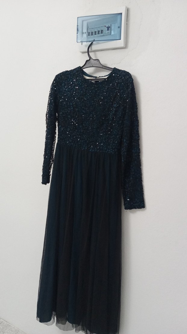 Boncuk işlemeli üst kısmı, uzun kollu ve yuvarlak yakalı, siyah renkli uzun ve dar kesim abiye elbise. Partiler için şık ve göz alıcıdır.