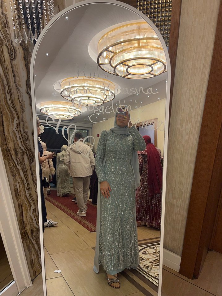 Uzun, vücuda oturan kesime sahip bu abiye. Boncuk işlemeli yılan desenleriyle süslenmiş, yeşil renktedir. Şalını da yanında gönderirim isterseniz.Balık model vücuda yapışan bir elbisedir. Ben vücut hatlarımı belli etmesin diye arkasına şifon kumaş yaptırmıştım ilk fotodaki gibi ama satılınca söktürebilirim çünkü giyince biraz söküldü arkadan